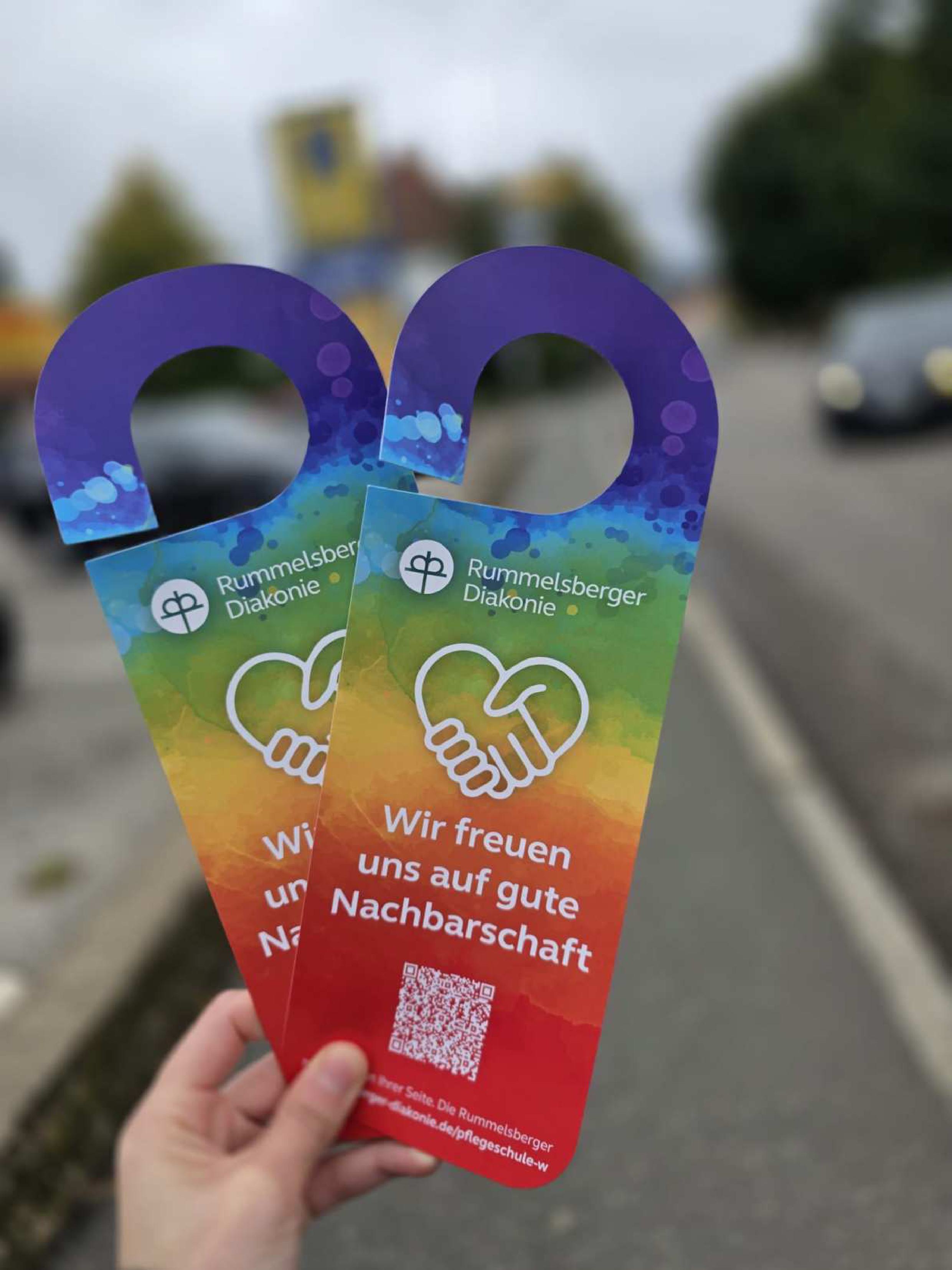 13. Oktober 2025Weißenburg - Mit einer kreativen Aktion haben Auszubildende der Berufsfachschule für Pflege und Altenpflegehilfe der Rummelsberger Diakonie in Weißenburg die Nachbarschaft des neuen Standorts persönlich eingeladen: Türhänger in Vielfalts-Farben, ganz nach dem Motto „Auf gute Nachbarschaft!“, verteilten die Schüler*innen in den umliegenden Straßen – und freuen sich nun auf regen Besuch zur feierlichen Einweihung in der historischen Dörfler Villa am Freitag, 17. Oktober 2025.