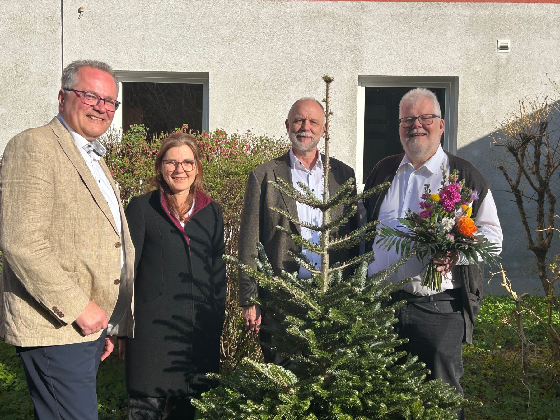 Als Zeichen der Anerkennung trägt der Weihnachtsbaum vor dem Stephanushaus künftig den Namen „Bruder-Schmidt-Baum“. Kolleg*innen überreichten ihm zudem ein gemeinschaftliches Abschiedsgeschenk für den neuen Lebensabschnitt.