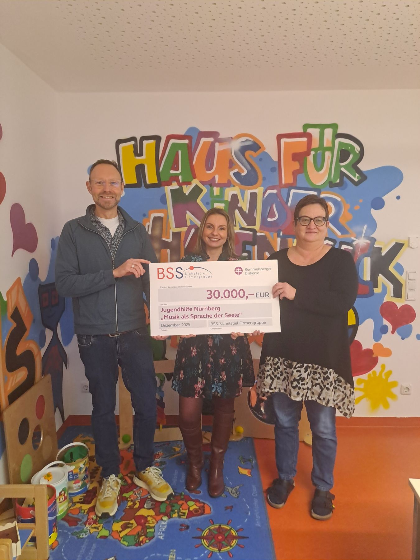 Bianca Großkreuz, Leitung der Kindertagesstätte Haus für Kinder am Hasenbuck, freut sich besonders über die positiven Effekte: „Musik stärkt das Gedächtnis, die Konzentration und die emotionale Regulation. Sie hilft Kindern, sich auszudrücken und ihre Körperwahrnehmung zu schulen.“ Die Projekte finden übergreifend in allen Rummelsberger Kitas in Nürnberg statt und richten sich an Kinder aller Altersstufen. „Diese Spende wirkt direkt im Herzen Nürnbergs – für die Kinder vor Ort“, sagt Eva Adamaschek, Referentin Fundraising der Rummelsberger Diakonie. „Wir danken BSS Sichelstiel von Herzen für diese wertvolle Unterstützung und freuen uns auf ein Jahr voller Musik, Kreativität und strahlender Kinderaugen.“